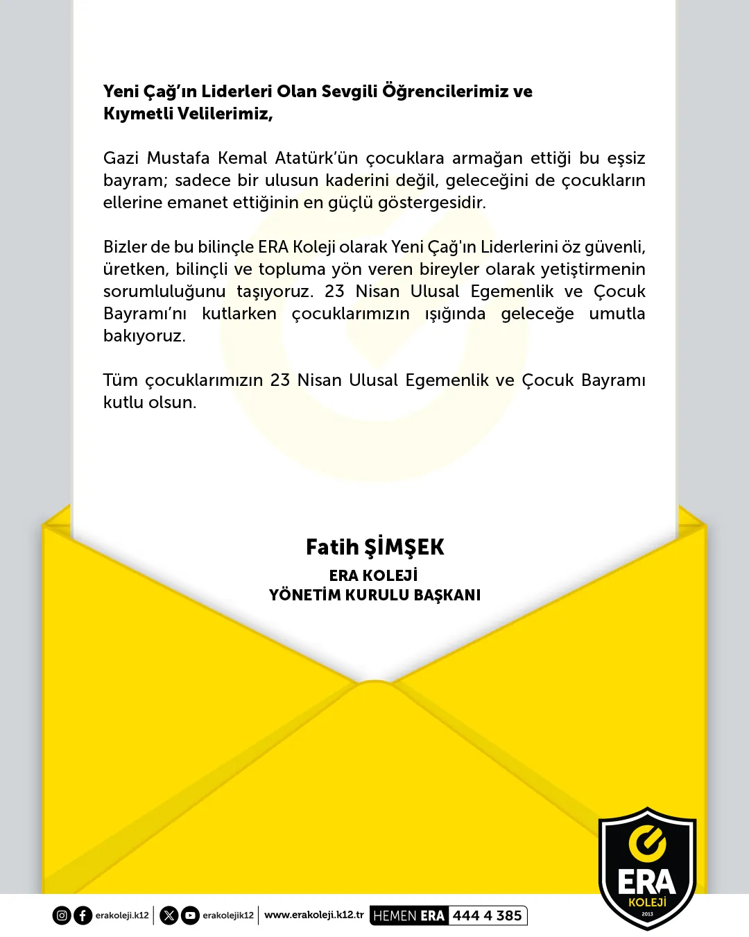 ERA Koleji Yönetim Kurulu Başkanımız Sayın Fatih ŞİMŞEK’in 23 Nisan Ulusal Egemenlik ve Çocuk Bayramı Mesajı